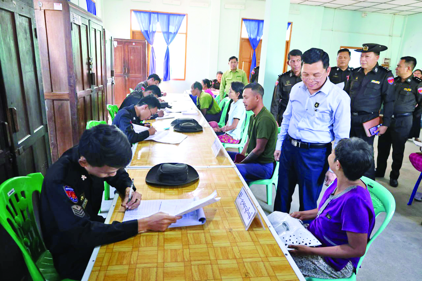 ထို့နောက် ပြည်ထောင်စုဝန်ကြီးသည် ဒေသခံပြည်သူများအနေဖြင့် အထွေထွေရွေးကောက်ပွဲတွင် နိုင်ငံသားစိစစ်ရေးကတ်ပြား ပျက်စီး/ပျောက်ဆုံးမှုကြောင့် မဲပေးပိုင်ခွင့်မဆုံးရှုံးစေရေးနှင့် နိုင်ငံသားကတ်ပြားကိုင်ဆောင်မဲပေးနိုင်ရေးအတွက် ဝန်ထမ်းများက ဒေသခံပြည်သူများအား ပန်းခင်းစီမံချက်အဆင့် (၃) ဖြင့် အိမ် ထောင်စုလူဦးရေစာရင်းနှင့် နိုင်ငံသားစိစစ်ရေးကတ်ပြား ထုတ်ပေးနိုင်ရန် လုပ်ထုံးလုပ်နည်းနှင့်အညီ စိစစ်၍ One Stop Service ဖြင့် လုပ်ငန်းစဉ်အဆင့်ဆင့် ဆောင်ရွက်နေမှုနှင့် နိုင်ငံသားစိစစ်ရေးကတ်ပြား ရရှိပြီးသူများအား e-ID စနစ်ဖြင့် Biographic/ Biometric ကောက်ယူကာ Unique ID နံပါတ်တစ်ပါတည်း ဆောင်ရွက်ထုတ်ပေးနေမှုအခြေအနေများကို လှည့်လည်ကြည့်ရှုအားပေးသည်။