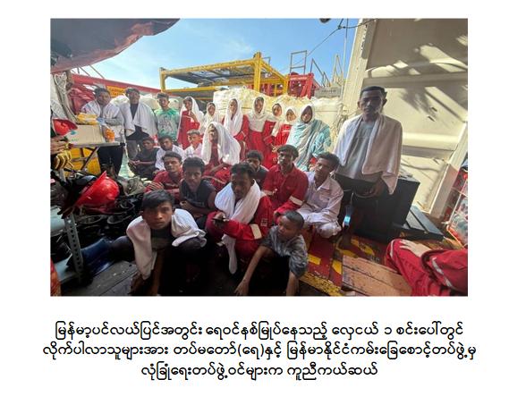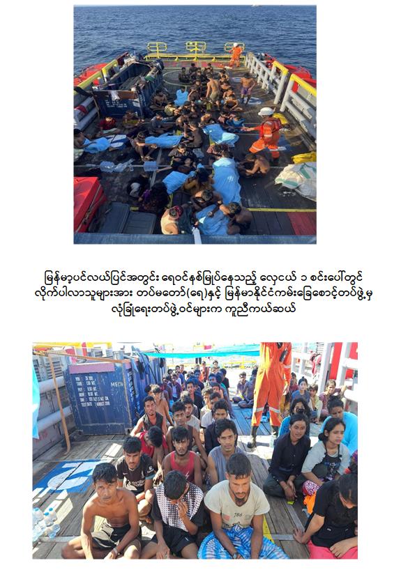 ရန်ကုန်တိုင်းဒေသကြီး၊ ရန်ကုန်မြို့၏ တောင်ဘက် ရေမိုင် ၁၅၆ မိုင်ခန့်အကွာရှိ မြန်မာ့ပင်လယ်ပြင်အတွင်း ရေဝင်နစ်မြုပ်နေသည့် လှေတစ်စင်းပေါ်မှ လိုက်ပါလာသူများအား တပ်မတော် (ရေ) နှင့် မြန်မာနိုင်ငံကမ်းခြေစောင့်တပ်ဖွဲ့မှ လုံခြုံရေးတပ်ဖွဲ့ဝင်များက ကူညီကယ်ဆယ်ရေးလုပ်ငန်းများ ဆောင်ရွက်ပေးခဲ့ကြောင်း သိရှိရသည်။