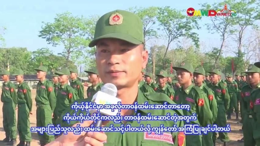 “ကျွန်တော်လည်း နိုင်ငံသားတစ်ယောက်တာဝန်ကျေဖို့အတွက် စစ်မှုထမ်းကို လာရောက်တာဝန်ထမ်းဆောင်တာဖြစ်ပါတယ်။ ကျွန်တော်လည်း စစ်မှုထမ်းချင်တာလည်း ပါပါတယ်။ ဘယ်လိုခံယူထားလဲဆိုရင် တပ်မတော်သားတစ်ယာက်ဖြစ်သွားရင်တော့ အကောင်းဆုံးဖြစ်အောင် ကြိုးစားသွားပါမယ်။ ဆရာတွေ/ နည်းပြတွေသင်ကြားပြသပေးတဲ့အတိုင်း ကောင်းကောင်းမွန်မွန် လေ့လာသင်ယူသွားမယ်လို့ ခံယူထားပါတယ်။ ကိုယ့်နိုင်ငံမှာ အခုလိုတာဝန်ထမ်းဆောင်တာတော့ ကိုယ်ကိုယ်တိုင်လည်း တာဝန်ထမ်းဆောင်နေပါတယ်။ အများပြည်သူလည်း ထမ်းဆောင်သင့်ပါတယ်လို့ ကျွန်တော်အကြံပြုချင်ပါတယ်။ ပြောရရင် ၂ နှစ်ပေါ့၊ ၂ နှစ်ထက် ကျော်ရင်လဲကျော်သွားမှာပေါ့။ ကျွန်တော်ထပ်ပြီးတာဝန်ထမ်းဆောင်ဖို့လည်း ရှိပါတယ်။ မိသားစုဆွေမျိုးတွေကတော့ ကျွန်တော်စစ်သားဖြစ်သွားလို့ ဂုဏ်ယူဖို့ပေါ့ ဒါပဲပြောချင်ပါတယ်။ တပ်မတော်သား တစ်ယောက်ဖြစ်သွားတဲ့အတွက် ကိုယ့်ကိုယ်လည်းဂုဏ်ယူပါတယ်။ ဒီလို ပြည်သူ့စစ်တာဝန်ထမ်းဆောင်ဖို့အတွက် ကျွန်တော်ကိုယ်တိုင်လည်း တာဝန်ထမ်းဆောင်နေပါတယ်။ ကျန်တဲ့နိုင်ငံသားတိုင်း၊ အကုန်လုံးတာဝန်ထမ်းဆောင်ဖို့အတွက် အကြံပြုချင်ပါတယ်”