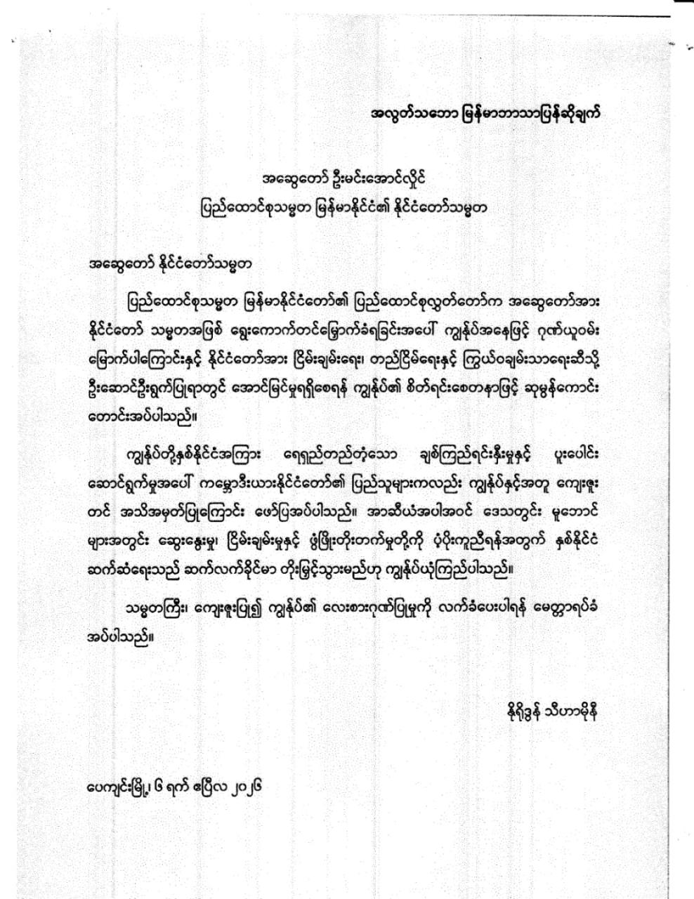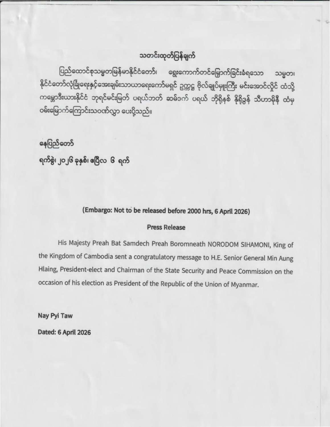 ပြည်ထောင်စုသမ္မတမြန်မာနိုင်ငံတော်၊ ရွေးကောက်တင်မြှောက်ခြင်းခံရသော သမ္မတ၊ နိုင်ငံတော်လုံခြုံရေးနှင့်အေးချမ်းသာယာရေးကော်မရှင်ဥက္ကဋ္ဌ ဗိုလ်ချုပ်မှူးကြီး မင်းအောင်လှိုင်ထံသို့ ကမ္ဘောဒီးယားနိုင်ငံ ဘုရင်မင်းမြတ် ပရယ်ဘတ် ဆမ်ဒက်ပရယ် ဘိုရိုနစ် နိုရိုဒွန် သီဟာမိုနီထံမှ ဝမ်းမြောက်ကြောင်းသဝဏ်လွှာ ပေးပို့