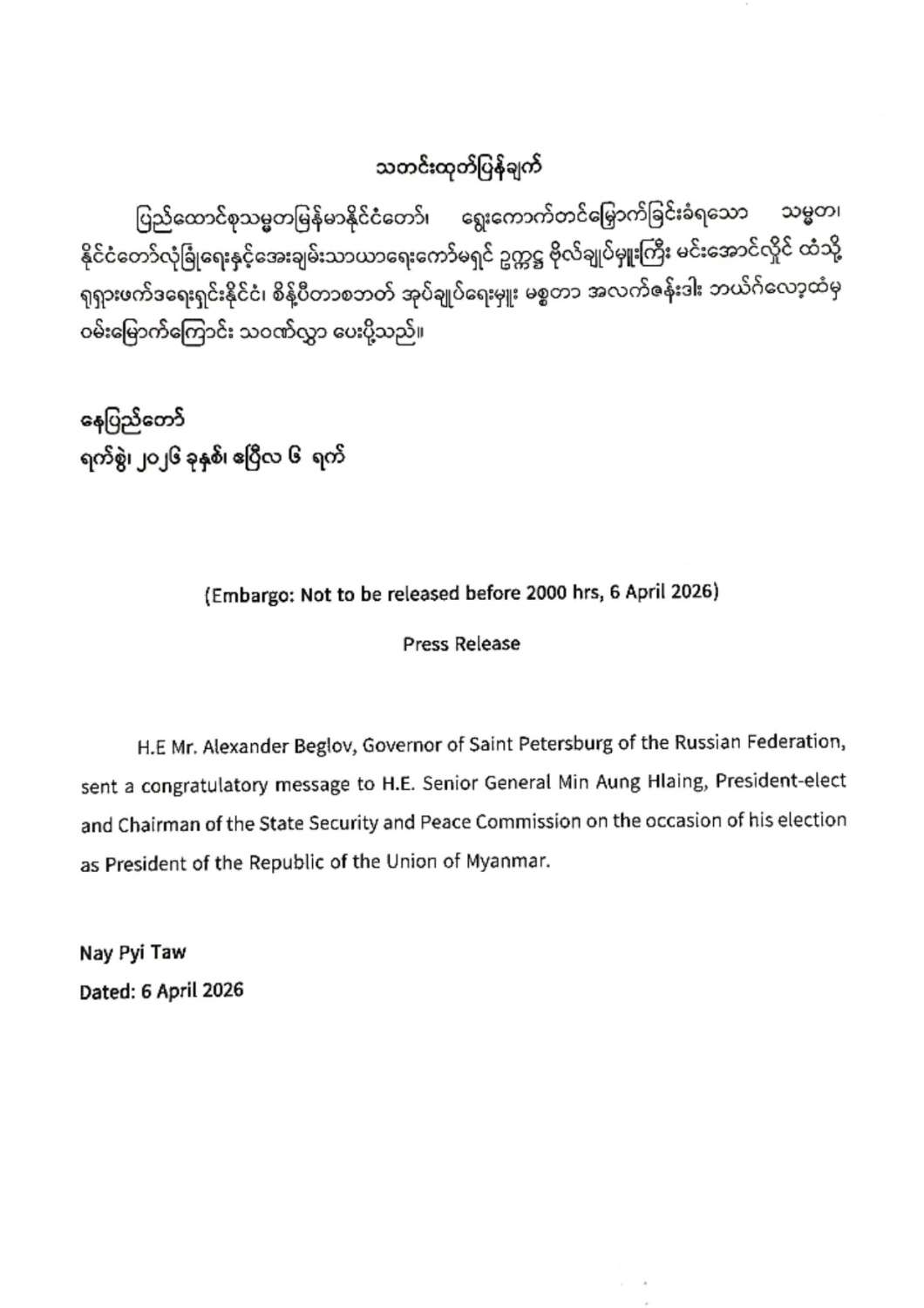 ပြည်ထောင်စုသမ္မတမြန်မာနိုင်ငံတော်၊ ရွေးကောက်တင်မြှောက်ခြင်းခံရသော သမ္မတ၊ နိုင်ငံတော်လုံခြုံရေးနှင့်အေးချမ်းသာယာရေးကော်မရှင်ဥက္ကဋ္ဌ ဗိုလ်ချုပ်မှူးကြီး မင်းအောင်လှိုင်ထံသို့ ရုရှားဖက်ဒရေးရှင်းနိုင်ငံ စိန့်ပီတာစဘတ်အုပ်ချုပ်ရေးမှူး မစ္စတာ အလက်ဇန်းဒါး ဘယ်ဂ်လော့ထံမှ ဝမ်းမြောက်ကြောင်းသဝဏ်လွှာ ပေးပို့