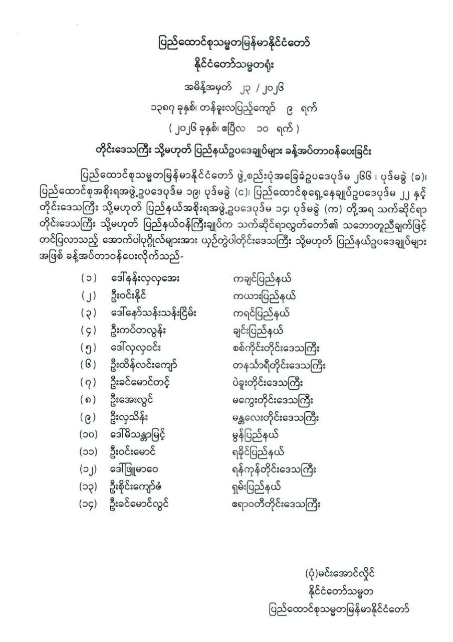တိုင်းဒေသကြီး သို့မဟုတ် ပြည်နယ်ဥပဒေချုပ်များ ခန့်အပ်တာဝန်ပေးခြင်း