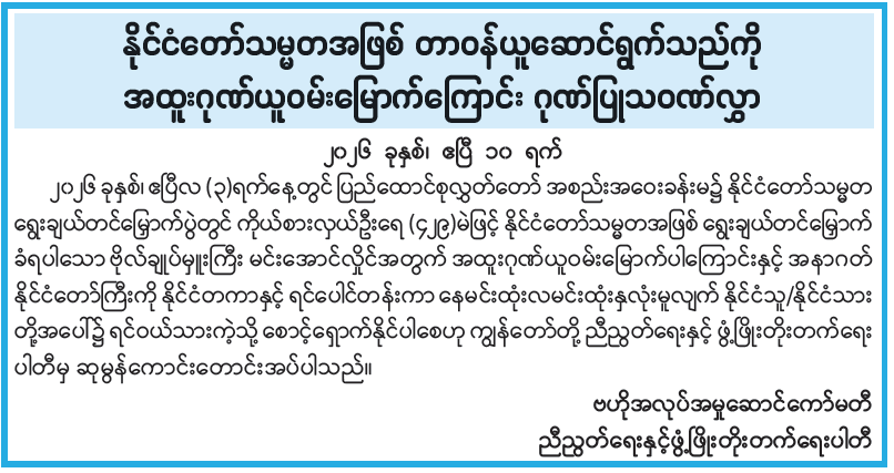 နိုင်ငံတော်သမ္မတအဖြစ် တာဝန်ယူဆောင်ရွက်သည်ကို အထူးဂုဏ်ယူဝမ်းမြောက်ကြောင်း ဂုဏ်ပြုသဝဏ်လွှာ