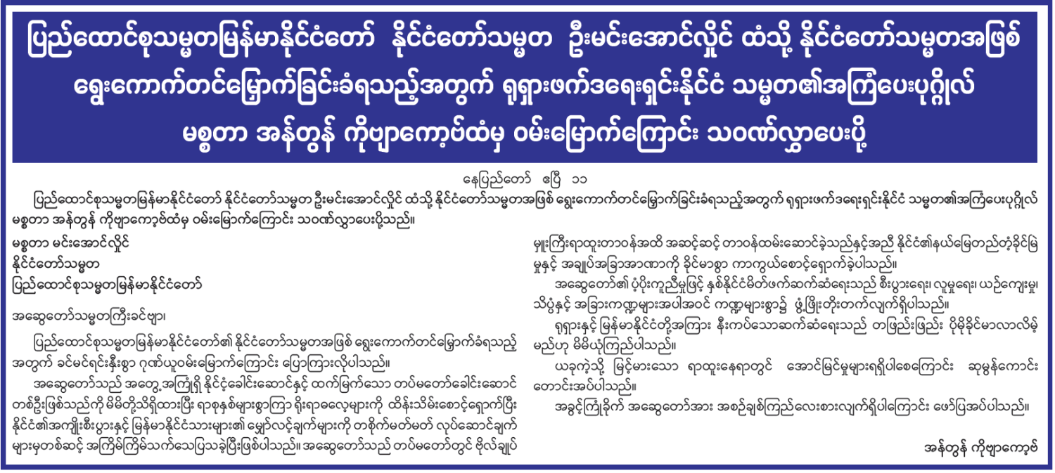 ပြည်ထောင်စုသမ္မတမြန်မာနိုင်ငံတော် နိုင်ငံတော်သမ္မတ ဦးမင်းအောင်လှိုင် ထံသို့ နိုင်ငံတော်သမ္မတအဖြစ် ရွေးကောက်တင်မြှောက်ခြင်းခံရသည့်အတွက် ရုရှားဖက်ဒရေးရှင်းနိုင်ငံသမ္မတ၏ အကြံပေးပုဂ္ဂိုလ် မစ္စတာ အန်တွန်ကိုဗျာကော့ဗ်ထံမှ ဝမ်းမြောက်ကြောင်း သဝဏ်လွှာပေးပို့