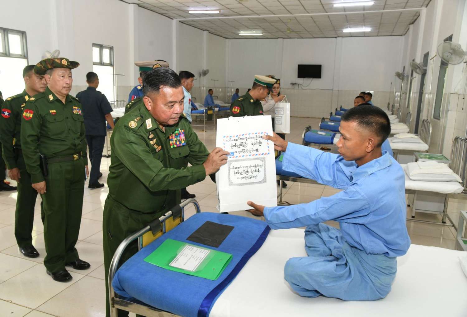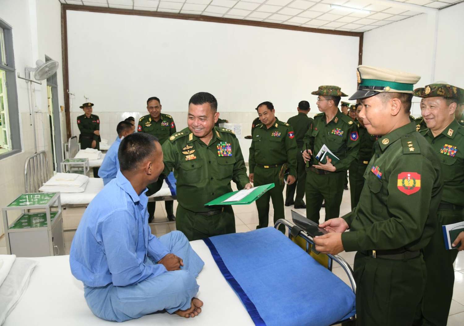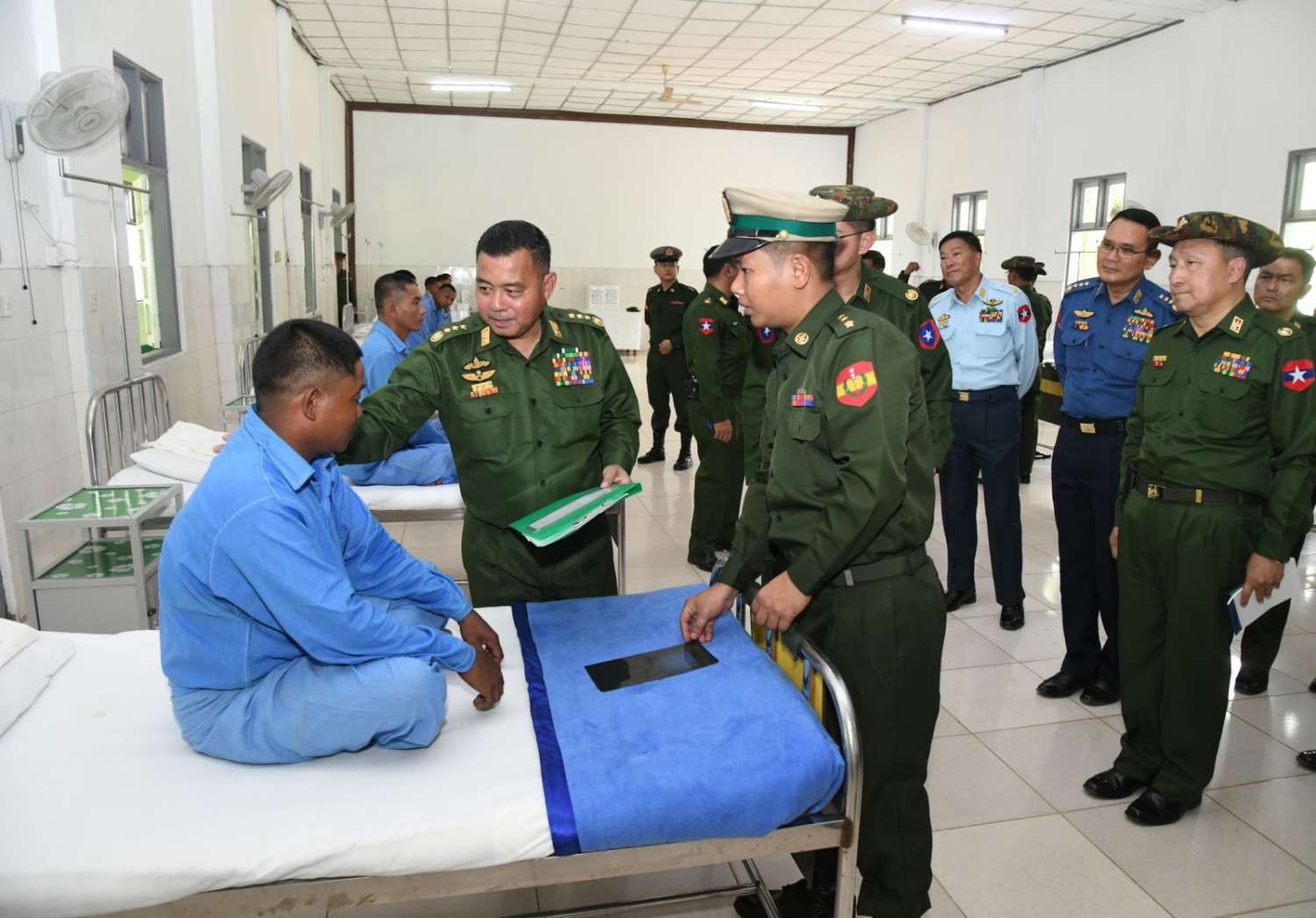ထို့နောက် တပ်မတော်ကာကွယ်ရေးဦးစီးချုပ်နှင့် အဖွဲ့ဝင်များသည် နယ်မြေခံတပ်မတော်ဆေးရုံတွင် တက်ရောက်ဆေးကုသမှုခံယူလျက်ရှိသည့် အရာရှိ၊ စစ်သည်၊ မြန်မာနိုင်ငံရဲတပ်ဖွဲ့ဝင်များ၊ ပြည်သူ့စစ် (ဌာနေ) တပ်ဖွဲ့ဝင်များအား လိုက်လံကြည့်ရှုပြီး တစ်ဦးချင်း၏ရောဂါဖြစ်ပွားမှုအခြေအနေများ၊ ဆေးဝါးကုသမှုပေးထားသည့်အခြေအနေများနှင့် ကျန်းမာရေးတိုးတက်ကောင်းမွန်မှုအခြေအနေများကို ရင်းရင်းနှီးနှီး မေးမြန်းအားပေးစကားပြောကြားပြီး စားသောက်ဖွယ်ရာများနှင့် ဂုဏ်ပြုချီးမြှင့်ငွေများပေးအပ်သည်။