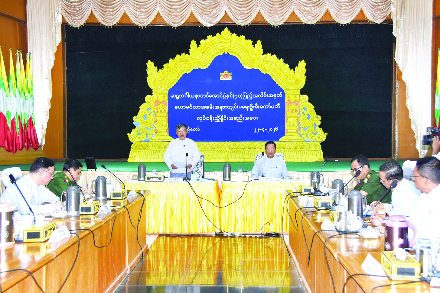 ရန်ကုန်တိုင်းဒေသကြီး မရမ်းကုန်းမြို့နယ် သီရိမင်္ဂလာကမ္ဘာအေးကုန်းမြေ မဟာပါသာဏလိုဏ်ဂူ သိမ်တော်ကြီးအတွင်း၌ကျင်းပမည့် ဆဋ္ဌသင်္ဂါယနာတင်အောင်ပွဲ နှစ် (၇၀) ပြည့် အထိမ်းအမှတ် မဟာမင်္ဂလာအခမ်းအနား အောင်မြင်စွာကျင်းပနိုင်ရေး ဦးစီးကော်မတီ လုပ်ငန်းညှိနှိုင်းအစည်းအဝေးကို ယနေ့နံနက်ပိုင်းက နေပြည်တော် ရုံးအမှတ် (၃၁) သာသနာရေးဝန်ကြီးဌာန အစည်းအဝေးခန်းမ (မြေညီထပ်) ၌ ကျင်းပသည်။