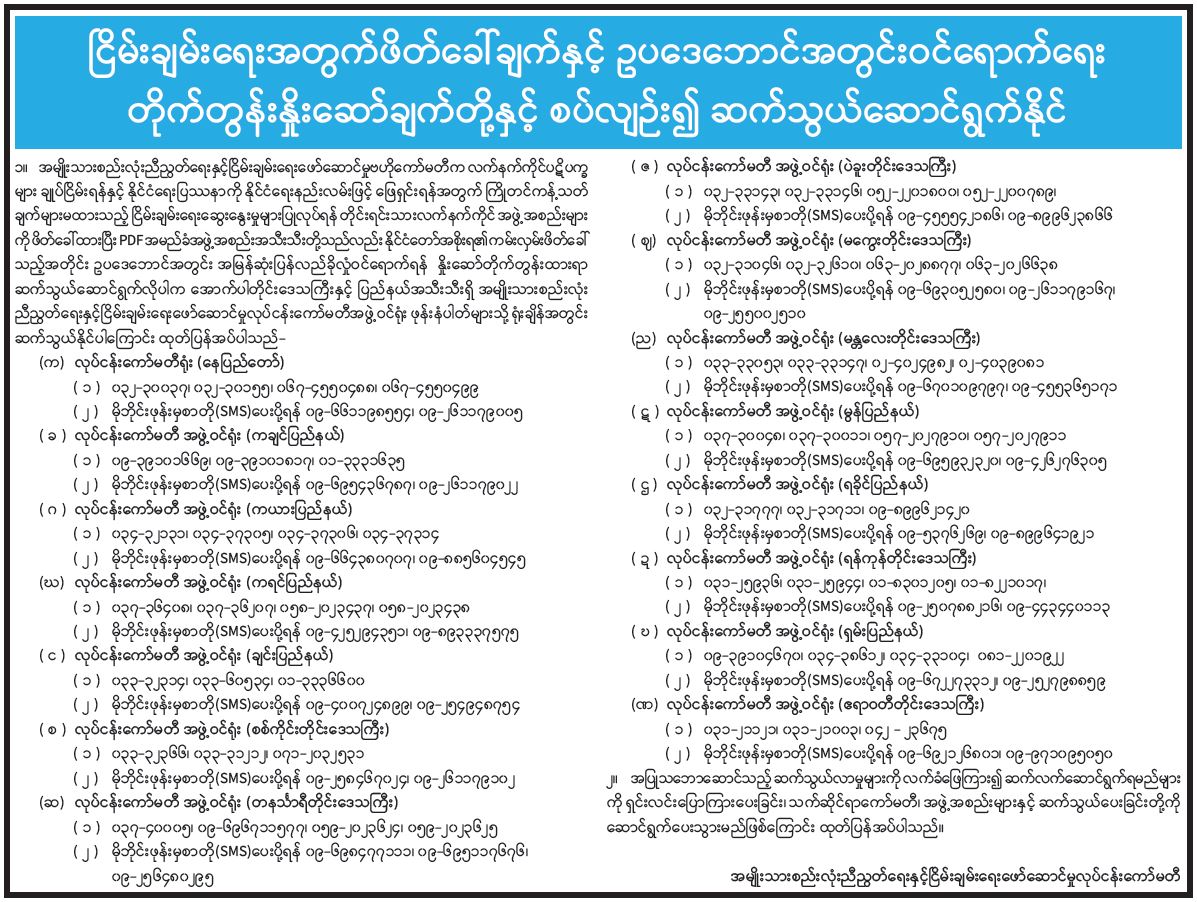 ငြိမ်းချမ်းရေးအတွက်ဖိတ်ခေါ်ချက်နှင့် ဥပဒေဘောင်အတွင်းဝင်ရောက်ရေး တိုက်တွန်းနှိုးဆော်ချက်တို့နှင့် စပ်လျဉ်း၍ ဆက်သွယ်ဆောင်ရွက်နိုင် 04/24/2026
