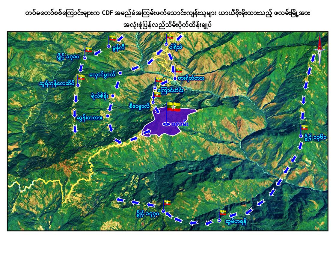 တပ်မတော်စစ်ကြောင်းများအနေဖြင့် ချင်းပြည်နယ်၊ ခရိုင်မြို့တော်ကြီးတစ်ခုဖြစ်သည့် ဖလမ်းမြို့အား အမြန်ဆုံးပြန်လည်သိမ်းပိုက်ရရှိနိုင်ရေးနှင့် CDF အမည်ခံ အကြမ်းဖက်သောင်းကျန်းသူများအား တိုက်ခိုက်ချေမှုန်းနိုင်ရေးအတွက် ကလေးမြို့နှင့် တီးတိန်မြို့တို့၌ လိုအပ်သည့်ပြင်ဆင်စုဖွဲ့မှုများနှင့် အုပ်ချုပ်ထောက်ပံ့မှုများကို ဖြည့်တင်းဆောင်ရွက်ခဲ့ပြီး မြေပြင်/ ဝေဟင် ဟန်ချက်ညီပေါင်းစပ်စုဖွဲ့၍ စစ်ကြောင်းများခွဲ၍ နယ်မြေရှင်းလင်းခြင်းများစတင်ခဲ့ပြီး တန်ပြန်တိုက်စစ်များ တစ်ဆင့်ပြီး တစ်ဆင့် ခြေကုပ်ယူထိုးဖောက်တိုက်ခိုက်ခဲ့ရာ ၂၀၂၅ ခုနှစ်၊ အောက်တိုဘာလ ၂၇ ရက်နေ့တွင် အကြမ်းဖက်သောင်းကျန်းသူများ ယာယီစိုးမိုးထားသော သာယာကုန်းကျေးရွာအားလည်းကောင်း၊ အောက်တိုဘာလ ၃၀ ရက်နေ့တွင် နတ်ချောင်းတံတားအားလည်းကောင်း၊ နိုဝင်ဘာလ ၃ ရက်နေ့တွင် ပွိုင့်-၂၂၄၄ တောင်ကုန်းအားလည်းကောင်း၊ နိုဝင်ဘာလ ၄ ရက်နေ့တွင် ကနေဒီတောင်နှင့် ဝေဘူလစခန်းတို့အားလည်းကောင်း၊ နိုဝင်ဘာလ ၈ ရက်နေ့တွင် ပွိုင့် ၂၀၆၄ တောင်ကုန်းအားလည်းကောင်း၊ နိုဝင်ဘာလ ၉ ရက်နေ့တွင် သိုင်းငင်းစခန်းအားလည်းကောင်း၊ နိုဝင်ဘာလ ၁၇ ရက်နေ့တွင် ပွိုင့် ၁၃၆၁ တောင်ကုန်းအားလည်းကောင်း၊ နိုဝင်ဘာလ ၂၆ ရက်နေ့တွင် ဇောင်ကောင်ကျေးရွာအား လည်းကောင်း၊ ၂၀၂၆ ခုနှစ်၊ ဖေဖော်ဝါရီလ ၂ ရက်နေ့တွင် ဇွယ်လေကျေးရွာအားလည်းကောင်း၊ ဖေဖော်ဝါရီလ ၁၀ ရက်နေ့တွင် ထင်းရှူးစခန်းကျေးရွာအားလည်းကောင်း၊ မတ်လ ၃၁ ရက်နေ့တွင် ပါသဲကျေးရွာအားလည်းကောင်း၊ ဧပြီလ ၁၉ ရက်နေ့တွင် ဗားတံတားအားလည်းကောင်း၊ ဧပြီလ ၂၂ ရက်နေ့တွင် ခွန်လီ ကျေးရွာအားလည်းကောင်း၊ ဧပြီလ ၂၃ ရက်နေ့တွင် ပွိုင့် ၁၇၁၀ တောင်ကုန်း၊ ကြောင်ဟင်ရှာကျေးရွာနှင့် ဆွန်ဟရန်ကျေးရွာတို့အားလည်းကောင်း၊ ဧပြီလ ၂၄ ရက် နေ့တွင် ဆူရ်ဘုန်လေဆိပ်နှင့် ဆီဇာမော်ကျေးရွာတို့အားလည်းကောင်း အသီးသီးအောင်မြင်စွာ ပြန်လည်ထိန်းချုပ်နိုင်ခဲ့ပြီး ဧပြီလ ၂၅ ရက်နေ့ ယနေ့တွင် အကြမ်းဖက်သမားများ ယာယီစိုးမိုးထားသည့် ဖလမ်းမြို့အား တပ်မတော်စစ်ကြောင်းများက အပြီးအတိုင်အလုံးစုံ ပြန်လည်သိမ်းပိုက် ထိန်းချုပ်နိုင်ခဲ့သည်။