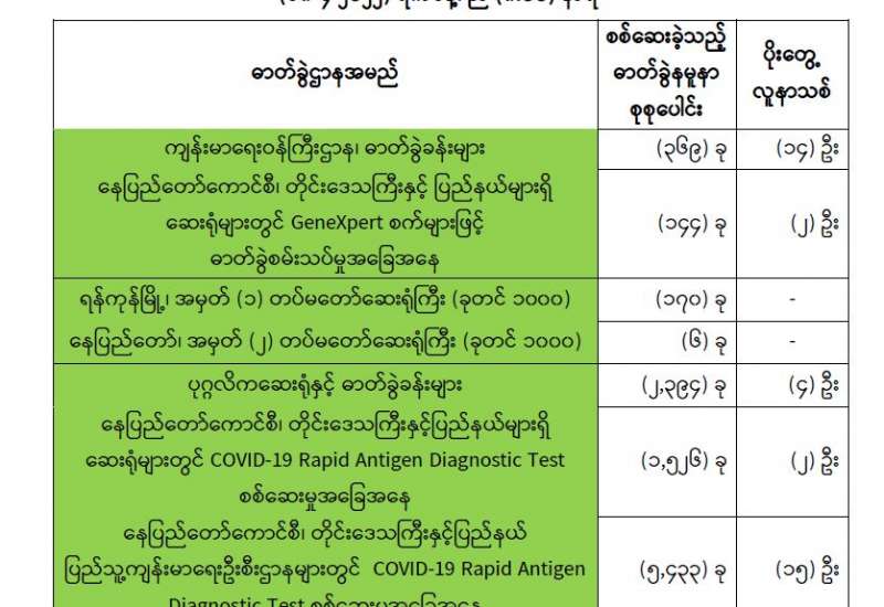 ကျန်းမာရေးဝန်ကြီးဌာနအနေဖြင့် နိုင်ငံအတွင်း ကူးစက်ဖြစ်ပွားနေသော COVID-19 ရောဂါ ကာကွယ်၊ ကုသ၊ ထိန်းချုပ်ရေးလုပ်ငန်းများကို အရှိန်အဟုန်မြှင့် ဆောင်ရွက်လျက်ရှိပါသည်။