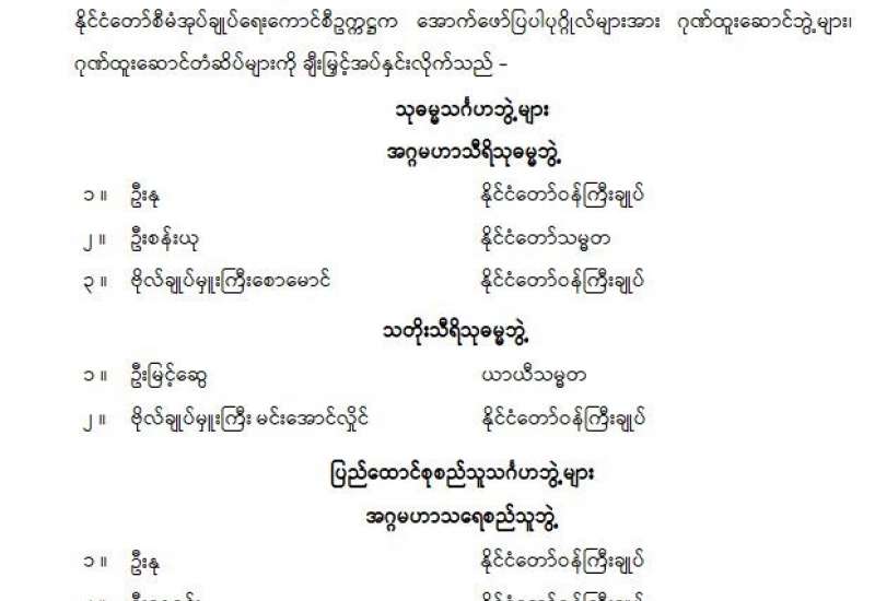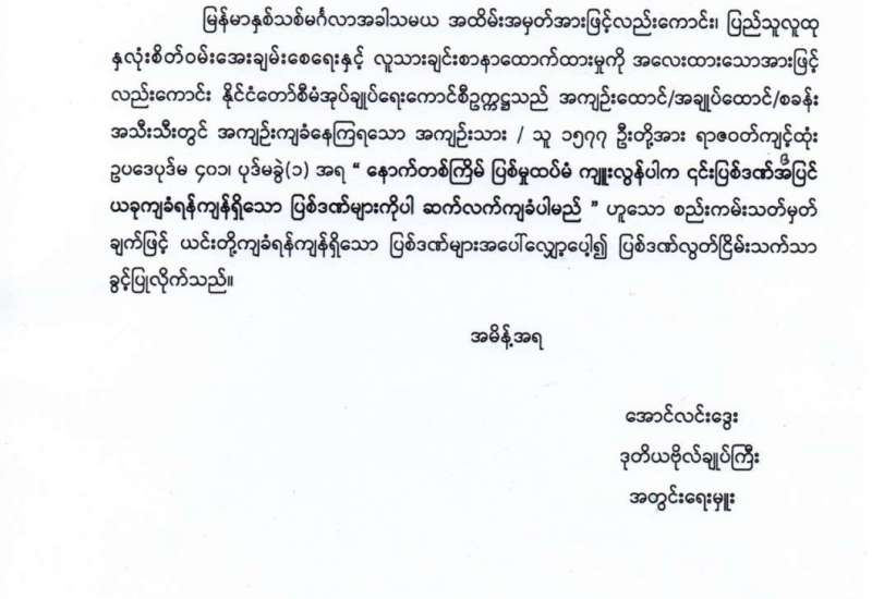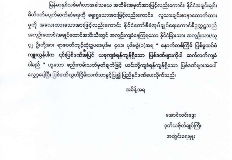 နှစ်ဟောင်းကနေ နှစ်သစ်ကိုကူးတဲ့ ဒီလိုအချိန်ခါမှာ ပြည်ထောင်စုအတွင်းမှာရှိတဲ့ တိုင်းရင်းသား ပြည်သူ ညီအစ်ကိုမောင်နှမများအားလုံး ကိုယ်စိတ်နှစ်ဖြာ ကျန်းမာချမ်းသာကြပါစေ၊ ကောင်းကျိုးလိုအင်ဆန္ဒများ ပြည့်ဝကြပါစေလို့ ဆုမွန်ကောင်း တောင်းအပ်ပါတယ်ခင်ဗျား။
