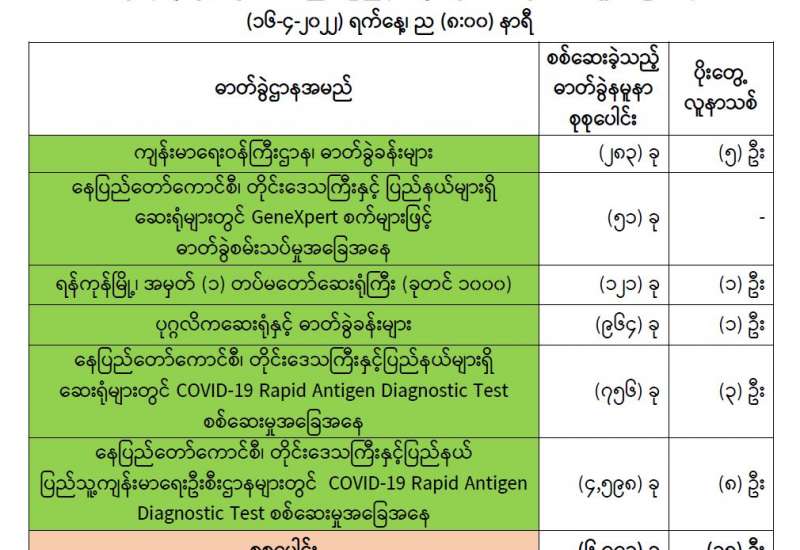 ကျန်းမာရေးဝန်ကြီးဌာနအနေဖြင့် နိုင်ငံအတွင်း ကူးစက်ဖြစ်ပွားနေသော COVID-19 ရောဂါ ကာကွယ်၊ ကုသ၊ ထိန်းချုပ်ရေးလုပ်ငန်းများကို အရှိန်အဟုန်မြှင့်ဆောင်ရွက်လျက်ရှိပါသည်။