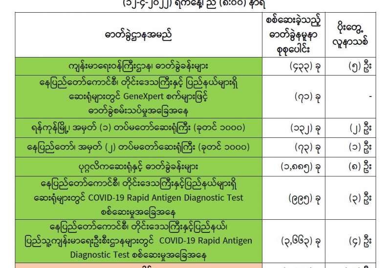 ကျန်းမာရေးဝန်ကြီးဌာနအနေဖြင့် နိုင်ငံအတွင်း ကူးစက်ဖြစ်ပွားနေသော COVID-19 ရောဂါ ကာကွယ်၊ ကုသ၊ ထိန်းချုပ်ရေးလုပ်ငန်းများကို အရှိန်အဟုန်မြှင့်ဆောင်ရွက်လျက်ရှိပါသည်။