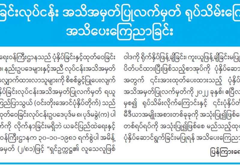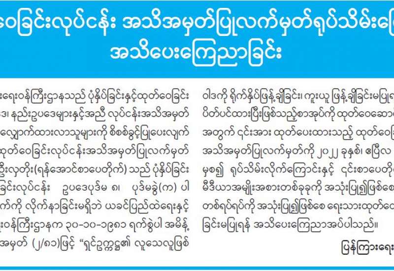 ပုံနှိပ်ခြင်းလုပ်ငန်း အသိအမှတ်ပြုလက်မှတ် ရုပ်သိမ်းကြောင်း အသိပေးကြေညာခြင်း