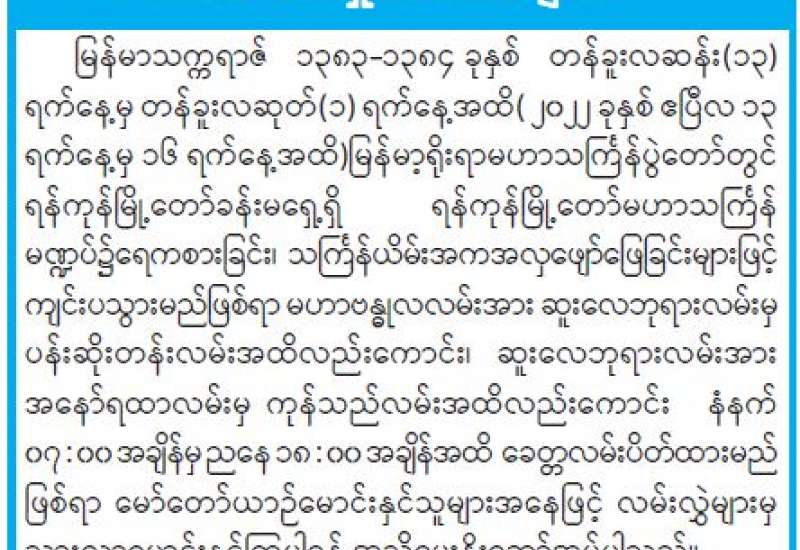 ယနေ့သည် မြန်မာသက္ကရာဇ် ၁၃၈၃ ခုနှစ် နှောင်းတန်ခူးလဆန်း ၁၃ ရက်နေ့ မဟာသင်္ကြန် အကြိုနေ့ဖြစ်သည်။ မြန်မာတို့၏ ရိုးရာအစဉ်အလာမပျက် နှစ်စဉ်ကျင်းပလေ့ရှိသော မဟာသင်္ကြန်ပွဲအခါကာလ သို့ရောက်ရှိလာပြီဖြစ်သည်။ ယခုနှစ်တွင်ကျင်းပမည့် ရိုးရာအစဉ်အလာမပျက် မဟာသင်္ကြန်ပွဲတော်ကာလသည် ယခင်နှစ်များနှင့်မတူ တစ်မူထူးခြားသည့် ပွဲတော်ကာလဟု ဆိုနိုင်သည်။