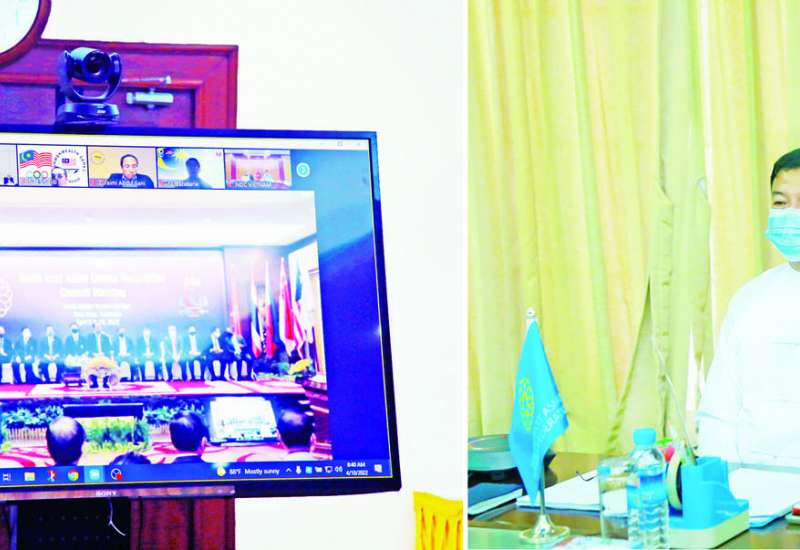 ကမ္ဘောဒီးယားနိုင်ငံ Borei Angkor Resort andSpa ၌ ယနေ့ နံနက် ၈ နာရီခွဲက ကျင်းပသည့် SEAGF COUNCILအစည်းအဝေးသို့မြန်မာနိုင်ငံ အိုလံပစ် ကော်မတီဥက္ကဋ္ဌ အားကစားနှင့်လူငယ်ရေးရာ ဝန်ကြီးဌာနပြည်ထောင်စုဝန်ကြီးဦးမင်းသိန်းဇံ၊ အားကစားနှင့်ကာယပညာဦးစီးဌာန ညွှန်ကြားရေးမှူးချုပ် ဦးထွန်းမြင့်ဦး၊ ယှဉ်ပြိုင်ရေးနှင့် လေ့ကျင့်ရေးဌာနခွဲ(၁)ညွှန်ကြားရေးမှူးဦးခွန်ဂျာအောင်၊ SOUTH EAST ASIAN GAMES FEDERATION မှ တာဝန်ရှိသူများနှင့် SEAGF COUNCIL အဖွဲ့ဝင်များက နေပြည်တော် ဝဏ္ဏသိဒ္ဓိအားကစားကွင်း အစည်းအဝေးခန်းမမှ ဗီဒီယိုကွန်ဖရင့်စနစ်ဖြင့် တက်ရောက်ကြသည်။