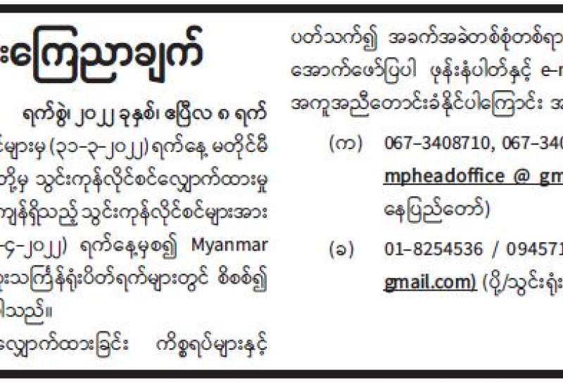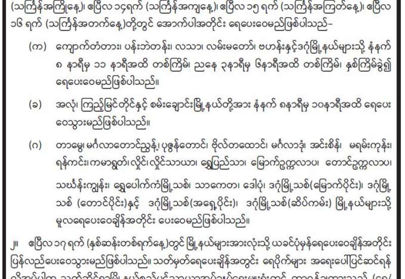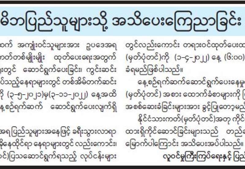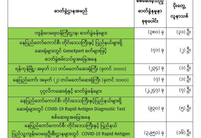 (၁၀-၄-၂၀၂၂) ရက်နေ့၊ ည (၈:၀၀) နာရီ ကျန်းမာရေးဝန်ကြီးဌာနအနေဖြင့် နိုင်ငံအတွင်း ကူးစက်ဖြစ်ပွားနေသော COVID-19 ရောဂါ ကာကွယ်၊ ကုသ၊ ထိန်းချုပ်ရေးလုပ်ငန်းများကို အရှိန်အဟုန်မြှင့်ဆောင်ရွက်လျက်ရှိရာ ရောဂါထိန်းချုပ်ရေး လုပ်ငန်းများ အောင်မြင်နိုင်ရေးအတွက် ပြည်သူလူထုအနေဖြင့် ကျန်းမာရေးဝန်ကြီးဌာနမှ ထုတ်ပြန် ထားသော COVID-19 ရောဂါကာကွယ်ထိန်းချုပ်ရေးဆိုင်ရာစည်းကမ်းများကို စနစ်တကျ လိုက်နာ ဆောင်ရွက်ရန်လိုအပ်ပြီး COVID-19 ကာကွယ်ဆေးထိုးနှံမှုခံယူခြင်းအား အထူးဂရုပြု ပူးပေါင်းဆောင် ရွက်ကြရန် လိုအပ်ပါသည်။