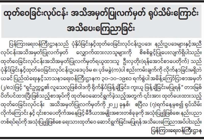 ပုံနှိပ်ခြင်းလုပ်ငန်း၊ ထုတ်ဝေခြင်းလုပ်ငန်းနှင့် သတင်းအေဂျင်စီလုပ်ငန်းလုပ်ကိုင်သူများ လုပ်ငန်းအသိ အမှတ်ပြုလက်မှတ် အသစ်လဲလှယ်ရန် အသိပေးကြေညာခြင်း