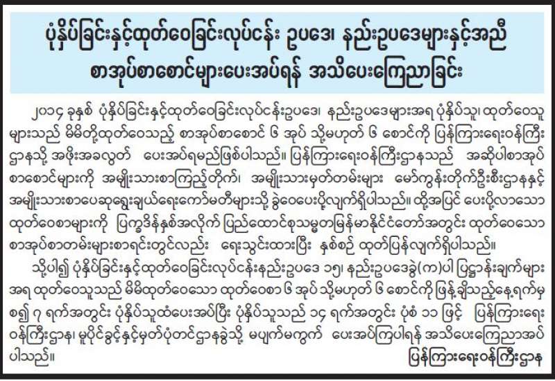 ပုံနှိပ်ခြင်းနှင့်ထုတ်ဝေခြင်းလုပ်ငန်း ဥပဒေ၊ နည်းဥပဒေများနှင့်အညီ စာအုပ်စာစောင်များပေးအပ်ရန် အသိပေးကြေညာခြင်း