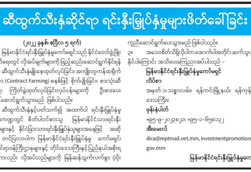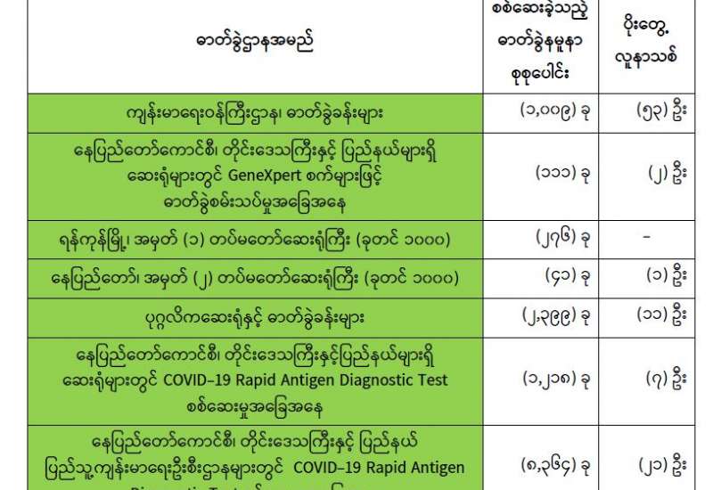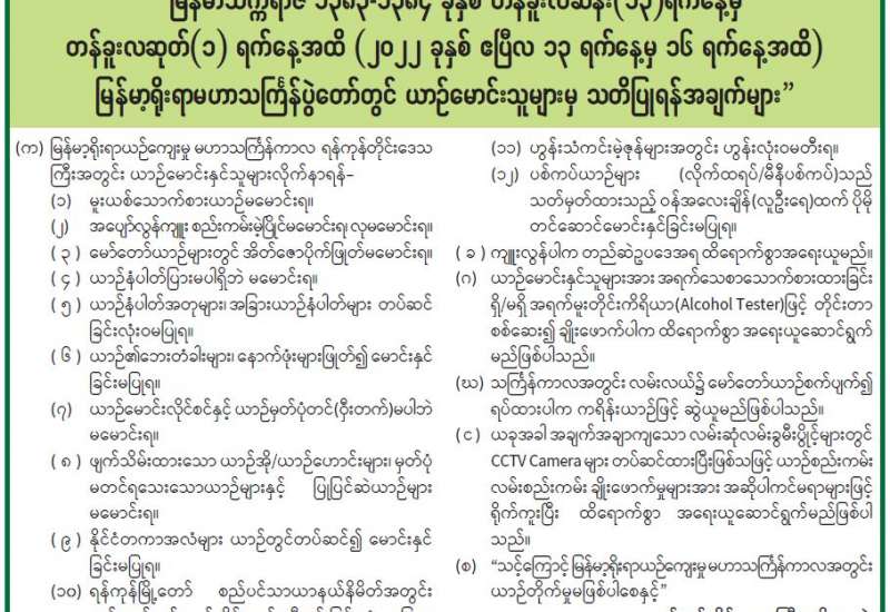 ကျန်းမာရေးဝန်ကြီးဌာနအနေဖြင့် နိုင်ငံအတွင်း ကူးစက်ဖြစ်ပွားနေသော COVID-19 ရောဂါ ကာကွယ်၊ ကုသ၊ ထိန်းချုပ်ရေးလုပ်ငန်းများကို အရှိန်အဟုန်မြှင့်ဆောင်ရွက်လျက်ရှိရာ ရောဂါထိန်းချုပ်ရေးလုပ်ငန်းများ အောင်မြင်နိုင်ရေးအတွက် ပြည်သူလူထုအနေဖြင့် ကျန်းမာရေး ဝန်ကြီးဌာနမှ ထုတ်ပြန်ထားသော COVID-19 ရောဂါ ကာကွယ်ထိန်းချုပ်ရေးဆိုင်ရာစည်းကမ်းများကို စနစ်တကျ လိုက်နာဆောင်ရွက်ရန် လိုအပ်ပြီး COVID-19 ကာကွယ်ဆေးထိုးနှံမှုခံယူခြင်းအား အထူးဂရုပြု ပူးပေါင်းဆောင်ရွက်ကြရန် လိုအပ်ပါသည်။