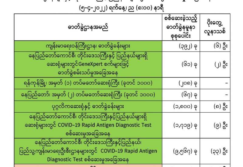 ကျန်းမာရေးဝန်ကြီးဌာနအနေဖြင့် နိုင်ငံအတွင်း ကူးစက်ဖြစ်ပွားနေသော COVID-19 ရောဂါ ကာကွယ်၊ ကုသ၊ ထိန်းချုပ်ရေးလုပ်ငန်းများကို အရှိန်အဟုန်မြှင့် ဆောင်ရွက်လျက်ရှိပါသည်။