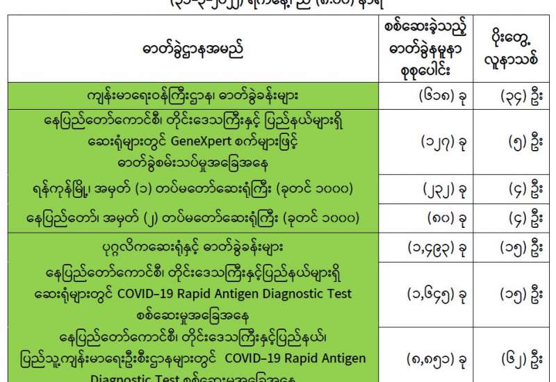 ကျန်းမာရေးဝန်ကြီးဌာနအနေဖြင့် နိုင်ငံအတွင်း ကူးစက်ဖြစ်ပွားနေသော COVID-19 ရောဂါ ကာကွယ်၊ ကုသ၊ ထိန်းချုပ်ရေးလုပ်ငန်းများကို အရှိန်အဟုန်မြှင့်ဆောင်ရွက်လျက်ရှိပါသည်။