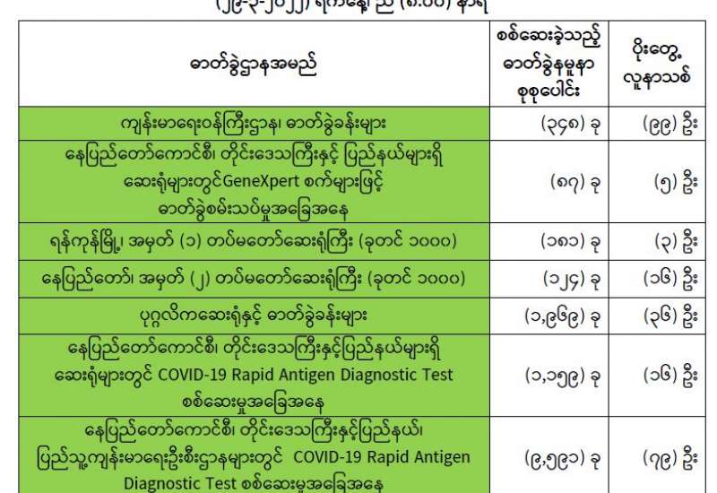 ကျန်းမာရေးဝန်ကြီးဌာနအနေဖြင့် နိုင်ငံအတွင်း ကူးစက်ဖြစ်ပွားနေသော COVID-19 ရောဂါ ကာကွယ်၊ ကုသ၊ ထိန်းချုပ်ရေးလုပ်ငန်းများကို အရှိန်အဟုန်မြှင့် ဆောင်ရွက်လျက်ရှိပါသည်။