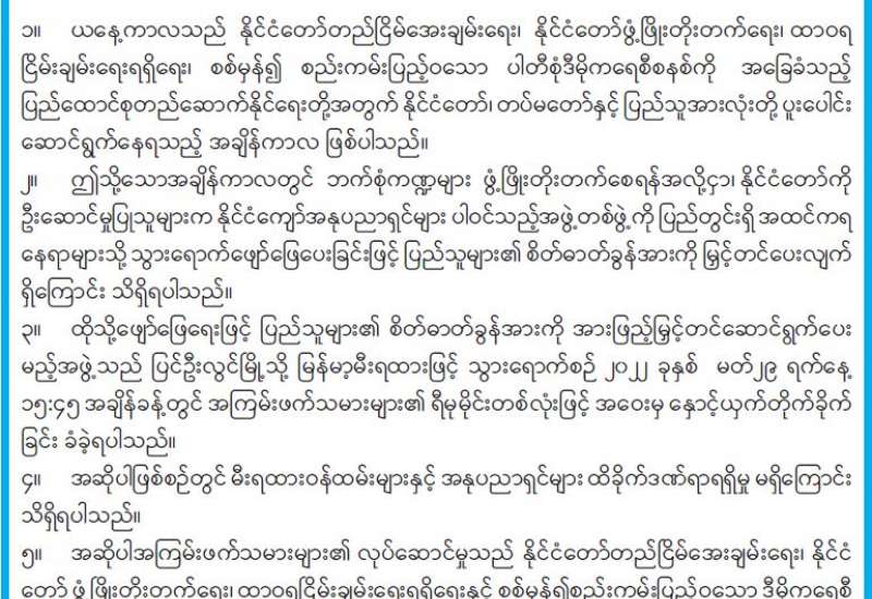 နိုင်ငံရေးအစွန်းရောက် အကြမ်းဖက်သမားများအနေဖြင့် နိုင်ငံတော်အတွင်း တည်ငြိမ် အေးချမ်းမှု ပျက်ပြားစေရန်နှင့် ပြည်သူလူထုအကြား စိုးရိမ်ထိတ်လန့်မှုဖြစ်ပေါ်လာစေရန် ရည်ရွယ်၍ ဌာနဆိုင်ရာအဆောက်အဦများ၊ လမ်းတံတားများနှင့် စာသင်ကျောင်းများအား အကြမ်းဖက်ဖောက်ခွဲမှုများပြုလုပ်ခြင်း၊ ပစ်ခတ်တိုက်ခိုက်မှုများ ပြုလုပ်ခြင်းနှင့် နိုင်ငံ့ဝန်ထမ်းများအား ရက်စက်စွာ လုပ်ကြံ သတ်ဖြတ်ခြင်းများ ပြုလုပ်လျက်ရှိသည့်အပြင် ဗုဒ္ဓဘာသာဝင်မြန်မာလူမျိုးများ၏ အထွဋ်အမြတ် ထားရာ သာသနာပိုင်အဆောက်အဦများကိုပါ အကြမ်းဖက်ပစ်ခတ်တိုက်ခိုက်ခြင်း၊ မိုင်းထောင် ဖောက်ခွဲခြင်းနှင့် ရဟန်းသံဃာတော်များအား ဖမ်းဆီးခေါ်ဆောင် သတ်ဖြတ်ခြင်းများ လုပ်ဆောင်လျက်ရှိသည်။