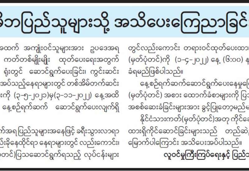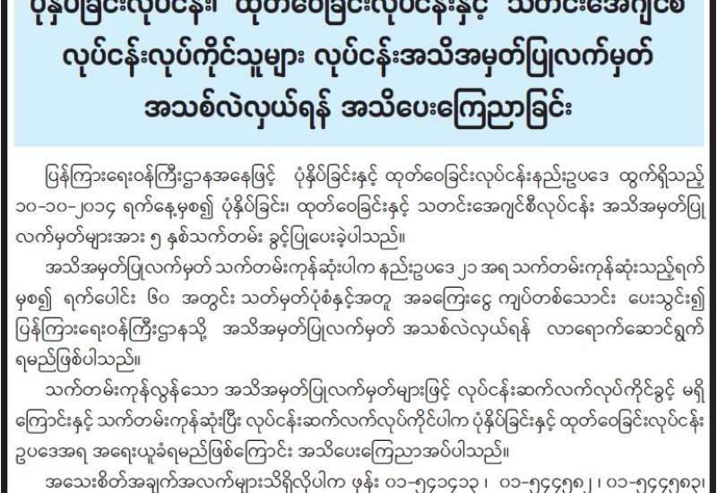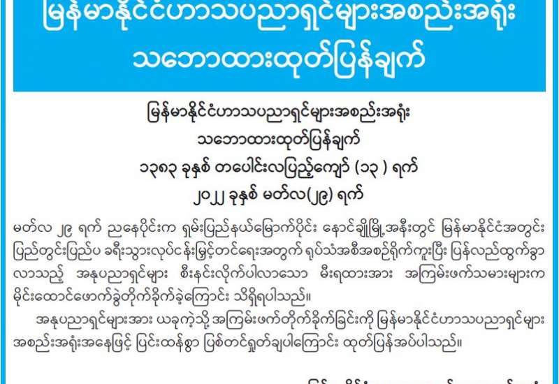 ပြန်ကြားရေးဝန်ကြီးဌာနအနေဖြင့် ပုံနှိပ်ခြင်းနှင့်ထုတ်ဝေခြင်းလုပ်ငန်းနည်းဥပဒေ ထွက်ရှိသည့် ၁၀-၁၀-၂၀၁၄ ရက်နေ့မှစ၍ ပုံနှိပ်ခြင်း၊ ထုတ်ဝေခြင်းနှင့် သတင်းအေဂျင်စီလုပ်ငန်း အသိအမှတ် ပြု လက်မှတ်များအား ၅ နှစ်သက်တမ်း ခွင့်ပြုပေးခဲ့ပါသည်။