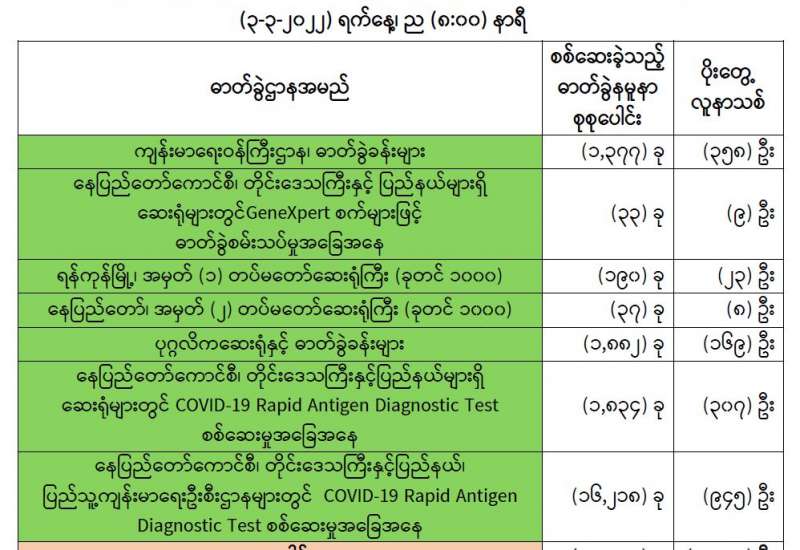 ကျန်းမာရေးဝန်ကြီးဌာနအနေဖြင့် နိုင်ငံအတွင်း ကူးစက်ဖြစ်ပွားနေသော COVID-19 ရောဂါ ကာကွယ်၊ ကုသ၊ ထိန်းချုပ်ရေးလုပ်ငန်းများကို အရှိန်အဟုန်မြှင့် ဆောင်ရွက်လျက်ရှိပါသည်။