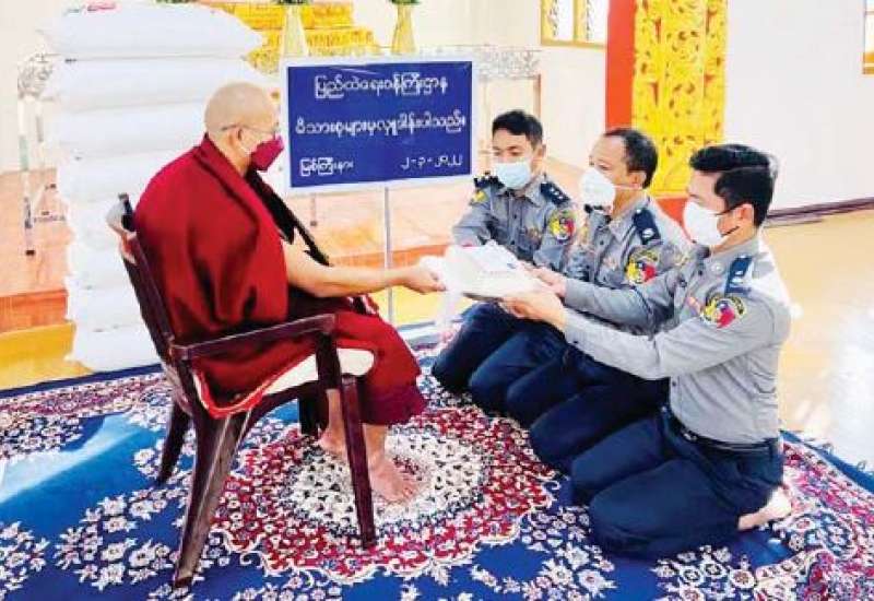 ပြည်ထဲရေးဝန်ကြီးဌာန၊ တပ်ဖွဲ့ဝင်/ ဝန်ထမ်း အရာထမ်း၊ အမှုထမ်းမိသားစုများက မြို့နယ်အသီးသီးရှိ ဘုန်းတော်ကြီးကျောင်းများသို့ ဆွမ်းဆန်တော်များ ဆက်ကပ်လှူဒါန်းခြင်းကို ဆောင်ရွက်လျက်ရှိသည်။