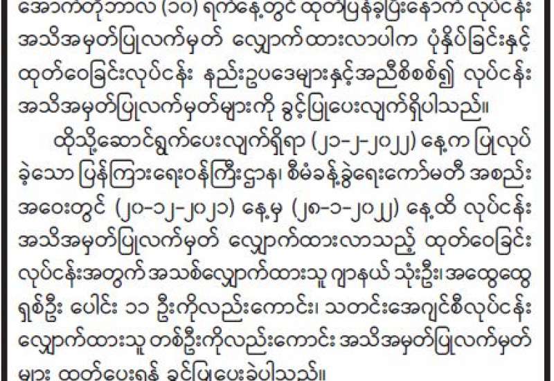 ပြန်ကြားရေးဝန်ကြီးဌာနသည် ပြည်ထောင်စုအစိုးရ၏ သဘောတူညီချက်ဖြင့် ပုံနှိပ်ခြင်း နှင့်ထုတ်ဝေခြင်းလုပ်ငန်း နည်းဥပဒေများကို အမိန့်ကြော်ငြာစာအမှတ် (၄၈/၂၀၁၄) ဖြင့် ၂၀၁၄ ခုနှစ်၊ အောက်တိုဘာလ (၁၀) ရက်နေ့တွင် ထုတ်ပြန်ခဲ့ပြီးနောက် လုပ်ငန်းအသိအမှတ်ပြု လက်မှတ် လျှောက်ထားလာပါက ပုံနှိပ်ခြင်းနှင့်ထုတ်ဝေခြင်းလုပ်ငန်း နည်းဥပဒေများနှင့်အညီ စိစစ်၍ လုပ်ငန်း အသိအမှတ်ပြု လက်မှတ်များကို ခွင့်ပြုပေးလျက်ရှိပါသည်။
