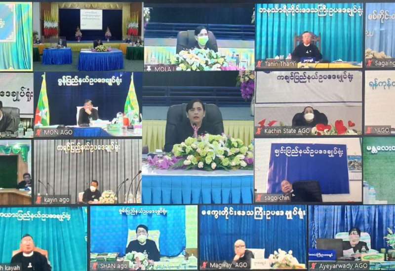 ဥပဒေရေးရာဝန်ကြီးဌာန ပြည်ထောင်စုဝန်ကြီးနှင့် ပြည်ထောင်စုရှေ့နေချုပ်နှင့် တိုင်းဒေသကြီး/ ပြည်နယ်ဥပဒေချုပ်များ၏ လစဉ်ပုံမှန် အစည်းအဝေးကို ယနေ့နံနက်ပိုင်းတွင် ဥပဒေရေးရာဝန်ကြီးဌာနတွင် Virtual စနစ်ဖြင့် ကျင်းပသည်။