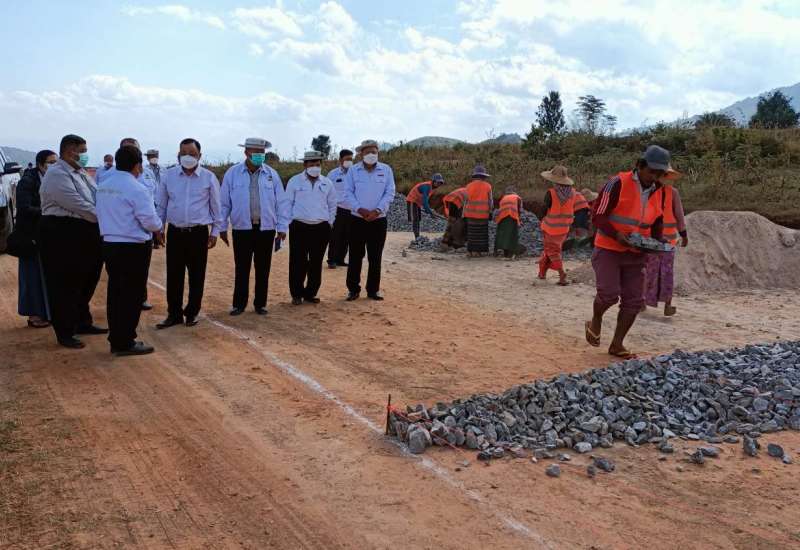 ဆောက်လုပ်ရေးဝန်ကြီးဌာန ဒုတိယဝန်ကြီး ဦးဝင်းဖေသည် ဌာနဆိုင်ရာတာဝန်ရှိသူများနှင့်အတူ ဒီဇင်ဘာ ၂၀ ရက် နံနက်ပိုင်းတွင် တောင်ပေါ်ဒေသ လမ်းဆောက်လုပ်ရေး ကုမ္ပဏီလီမိတက်မှ B.0.T စနစ်ဖြင့် ဆောင်ရွက်သော မိတ္ထီလာ - တောင်ကြီး| ကျိုင်းတုံ-တာချီလိတ်လမ်း (မိတ္ထီလာ-တောင်ကြီး)အပိုင်း လမ်းအဆင့်မြှင့်တင်ခြင်းလုပ်ငန်း ဆောင်ရွက်နေမှုအခြေအနေကို လမ်းတစ်လျှောက် ကြည့်ရှုစစ်ဆေးသည်။