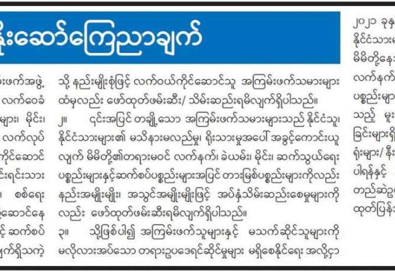 ကျန်းမာရေးဝန်ကြီးဌာနအနေဖြင့် နိုင်ငံအတွင်း ကူးစက်ဖြစ်ပွားနေသော COVID-19 ရောဂါ ကာကွယ်၊ ကုသ၊ ထိန်းချုပ်ရေး လုပ်ငန်းများကို အရှိန်အဟုန်မြှင့် ဆောင်ရွက်လျက်ရှိရာ ရောဂါ ထိန်းချုပ်ရေး လုပ်ငန်းများ အောင်မြင်နိုင်ရေးအတွက် ပြည်သူလူထုအနေဖြင့် ကျန်းမာရေး ဝန်ကြီး ဌာနမှထုတ်ပြန်ထားသော COVID-19 ရောဂါ ကာကွယ် ထိန်းချုပ်ရေးဆိုင်ရာ စည်းကမ်းများကို စနစ်တကျ လိုက်နာဆောင်ရွက်ရန်လိုအပ်ပြီး COVID-19 ကာကွယ်ဆေးထိုးနှံမှု ခံယူခြင်း အား အထူးဂရုပြု ပူးပေါင်းဆောင်ရွက်ကြရန် လိုအပ်ပါသည်။