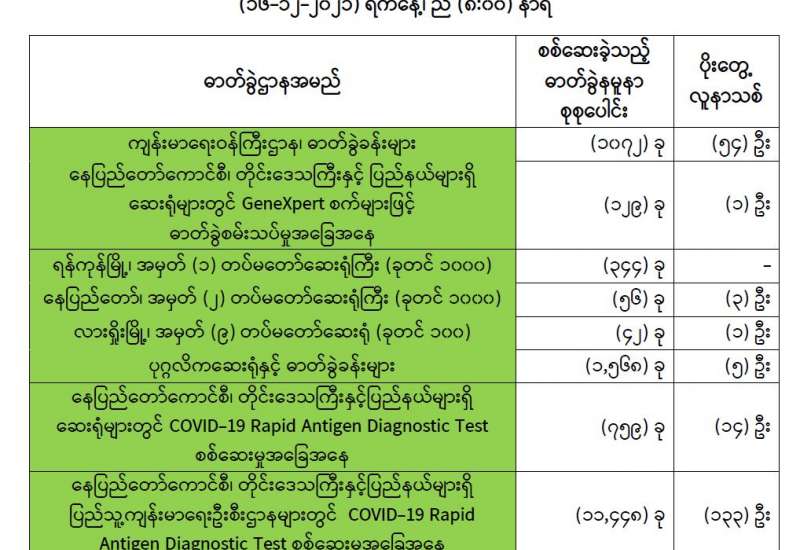 ကျန်းမာရေးဝန်ကြီးဌာနအနေဖြင့် နိုင်ငံအတွင်း ကူးစက်ဖြစ်ပွားနေသော COVID-19 ရောဂါ ကာကွယ်၊ ကုသ၊ ထိန်းချုပ်ရေးလုပ်ငန်းများကို အရှိန်အဟုန်မြှင့်ဆောင်ရွက်လျက်ရှိရာ ရောဂါထိန်း ချုပ်ရေးလုပ်ငန်းများ အောင်မြင်နိုင်ရေးအတွက် ပြည်သူလူထုအနေဖြင့် ကျန်းမာရေးဝန်ကြီးဌာနမှ ထုတ်ပြန်ထားသော COVID-19 ရောဂါကာကွယ်ထိန်းချုပ်ရေးဆိုင်ရာစည်းကမ်းများကို စနစ်တကျ လိုက်နာဆောင်ရွက်ရန်လိုအပ်ပြီး COVID-19 ကာကွယ်ဆေးထိုးနှံမှုခံယူခြင်းအား အထူးဂရုပြု ပူးပေါင်းဆောင်ရွက်ကြရန် လိုအပ်ပါသည်။