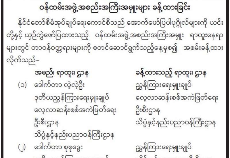 လူဝင်မှုကြီးကြပ်ရေးနှင့် ပြည်သူ့အင်အားဝန်ကြီးဌာန လက်ရှိလုပ်ငန်းဆောင်ရွက်ချက်များနှင့် ရှေ့လုပ်ငန်းစဉ်များ လုပ်ငန်းညှိနှိုင်းအစည်းအဝေးကို ယနေ့နံနက် ၉ နာရီတွင် နေပြည်တော်ရှိ အဆိုပါဝန်ကြီးဌာန၊ အစည်းအဝေးခန်းမ၌ ကျင်းပသည်။