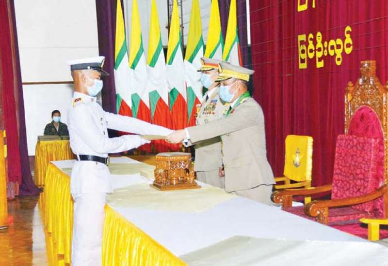 စစ်တက္ကသိုလ် ဗိုလ်လောင်းသင်တန်းအမှတ်စဉ် (၆၃) သင်တန်းဆင်းဂုဏ်ပြု စစ်ရေးပြ အခမ်းအနားကို ယနေ့ နံနက်ပိုင်းတွင် ပြင်ဦးလွင်မြို့၊ စစ်တက္ကသိုလ် စစ်ရေးပြကွင်း၌ ကျင်းပပြုလုပ်ရာ နိုင်ငံတော်စီမံအုပ်ချုပ်ရေး ကောင်စီဥက္ကဋ္ဌ၊ တပ်မတော်ကာကွယ်ရေးဦးစီးချုပ် ဗိုလ်ချုပ်မှူးကြီး မဟာသရေစည်သူ မင်းအောင်လှိုင် တက်ရောက်မိန့်ခွန်း ပြောကြားသည်။