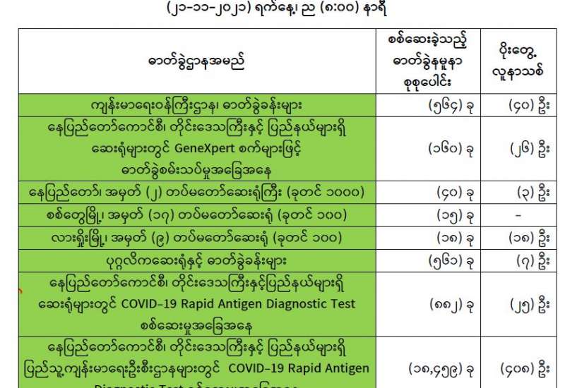 ကျန်းမာရေးဝန်ကြီးဌာနသည် ကိုဗစ်-၁၉ ရောဂါ ကာကွယ် ထိန်းချုပ်ရေးအတွက်ပြည်ထောင်စု နယ်မြေ နေပြည်တော်၊ တိုင်းဒေသကြီး/ပြည်နယ်များတွင် ကိုဗစ်၁၉ရောဂါကာကွယ်ဆေးကို ထိုးနှံ ပေးလျက်ရှိရာ ယနေ့အထိ ကျန်းမာရေးဝန်ကြီးဌာန အနေ ဖြင့် ဝယ်ယူထားရှိသည့် ကိုဗစ်၁၉ရောဂါကာကွယ်ဆေးစုစုပေါင်း ၃၁သန်း doses နှင့် ကျန်းမာရေး ဝန်ကြီးဌာနသို့ မိတ်ဆွေနိုင်ငံများ မှ လှူဒါန်းလာသည့် ကိုဗစ်-၁၉ ရောဂါကာကွယ်ဆေး စုစုပေါင်း ၉၁၆၈၈၀၀ doses ရရှိပြီးဖြစ်၍ ဝယ်ယူမှုနှင့် လှူဒါန်းမှုတို့မှ စုစုပေါင်း ကိုဗစ်-၁၉ ရောဂါကာကွယ်ဆေး ၄၀၁၆၈၈၀၀ doses ရောက်ရှိပြီး ဖြစ်သည်။