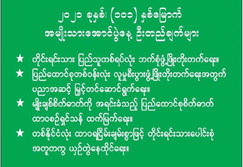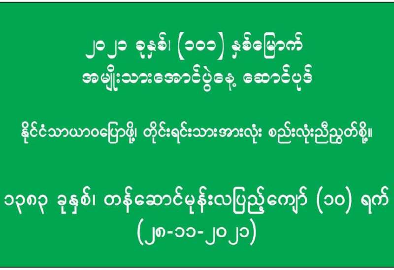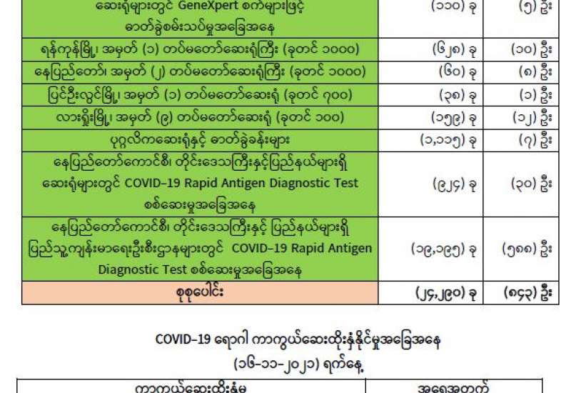 ကျန်းမာရေးဝန်ကြီးဌာနအနေဖြင့် နိုင်ငံအတွင်း ကူးစက်ဖြစ်ပွားနေသော COVID-19 ရောဂါ ကာကွယ်၊ ကုသ၊ ထိန်းချုပ်ရေးလုပ်ငန်းများကို အရှိန်အဟုန်မြှင့်ဆောင်ရွက်လျက်ရှိရာ ရောဂါ ထိန်းချုပ်ရေးလုပ်ငန်းများ အောင်မြင်နိုင်ရေးအတွက် ပြည်သူလူထုအနေဖြင့် ကျန်းမာရေး ဝန်ကြီးဌာနမှ ထုတ်ပြန်ထားသော COVID-19 ရောဂါကာကွယ်ထိန်းချုပ်ရေးဆိုင်ရာ စည်းကမ်းများကို စနစ်တကျ လိုက်နာဆောင်ရွက်ရန် လိုအပ်ပြီး COVID-19 ကာကွယ်ဆေး ထိုးနှံမှုခံယူခြင်းအား အထူးဂရုပြု ပူးပေါင်းဆောင်ရွက်ကြရန် လိုအပ်ပါသည်။