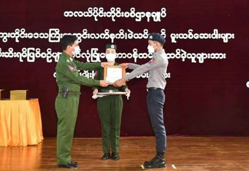 မကွေးတိုင်းဒေသကြီးအတွင်း လက်နက်/ခဲယမ်းများနှင့် မူးယစ်ဆေးဝါးများ ဖမ်းဆီးရမိခဲ့သည့် ဖြစ်စဉ်များတွင် စွမ်းစွမ်းတမံ ဆောင်ရွက်ခဲ့ကြသည့် လုံခြုံရေး တပ်ဖွဲ့ဝင်များအား ဂုဏ်ပြုချီးမြှင့် ခြင်းကို ယနေ့နံနက်ပိုင်းတွင် မကွေးမြို့ရှိ နယ်မြေခံ တပ်နယ်ခန်းမ၌ ပြုလုပ်ရာ မကွေး တိုင်းဒေသကြီးဝန်ကြီးချုပ် ဦးတင့်လွင်၊ အလယ်ပိုင်းတိုင်းစစ်ဌာနချုပ် တိုင်းမှူး ဗိုလ်ချုပ် ကိုကိုဦးနှင့် ဌာနဆိုင်ရာ တာဝန်ရှိ သူများ၊ လုံခြုံရေးတပ်ဖွဲ့ဝင်များ တက်ရောက်ကြသည်။