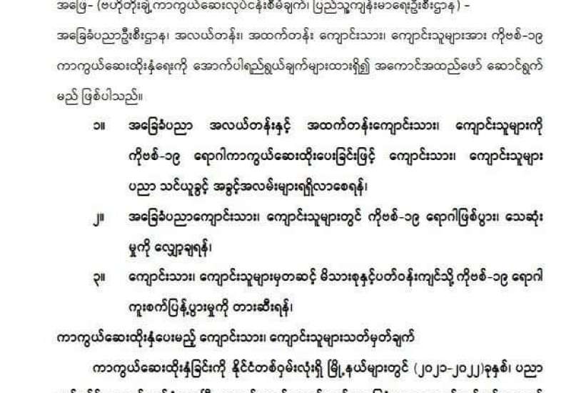 ကိုဗစ်-၁၉ ရောဂါ ကာကွယ်၊ ထိန်းချုပ်၊ ကုသရေး ဆောင်ရွက်ရာတွင် ကာကွယ်ဆေးထိုးနှံခြင်းသည် အဓိကအခန်းကဏ္ဍတွင် ပါဝင်သည့် လုပ်ငန်းတစ်ရပ် ဖြစ်သောကြောင့် ကိုဗစ်-၁၉ ရောဂါ ကာကွယ်ဆေးထိုးနှံမှုကို တိုင်းဒေသကြီးနှင့် ပြည်နယ်အသီးသီးတို့၌ တပ်မတော်မှ ဆေးအဖွဲ့များ၊ ပြည်သူ့ဆေးရုံများမှ ဆရာဝန် များ၊ သူနာပြုများ၊ ကျန်းမာရေးဝန်ထမ်းများနှင့် စေတနာ့ဝန်ထမ်းများက ကာကွယ် ဆေးထိုးခြင်းလုပ်ငန်းများကို အင်တိုက်အားတိုက် ဆောင်ရွက်ပေးလျက်ရှိ သည်။