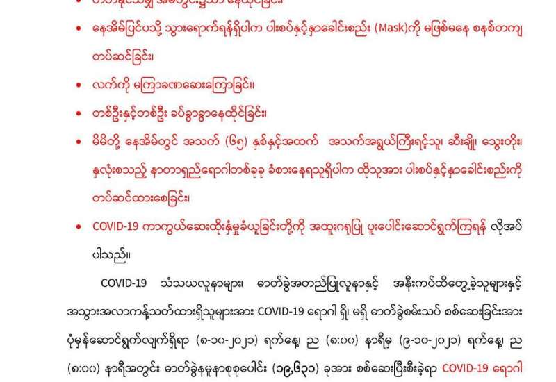 ပြည်ပနိုင်ငံများမှ ဝင်ရောက်လာသည့် မြန်မာနိုင်ငံသားများကို နယ်စပ်ဂိတ် အသီးသီးတွင် လက်ခံဆောင်ရွက်ပေးလျက်ရှိရာ အောက်တိုဘာ ၉ ရက်တွင် ရှမ်းပြည်နယ်(မြောက်ပိုင်း)၊ မူဆယ်မြို့၊ မြန်မာ-တရုတ် နှစ်နိုင်ငံနယ်စပ်၊ နန်းတော် စစ်ဆေးရေးဂိတ်မှ အမျိုးသား ၁၈၉ ဦး၊ အမျိုးသမီး ၁၆၁ ဦး၊ စုစုပေါင်း ၃၅၀ ဦးနှင့် လောက်ကိုင်မြို့၊ ရန်လုံကျိုင်းတံတားမှ အမျိုးသား ၂ ဦးနှင့် အမျိုးသမီး ၁ ဦးတို့ကို အသီးသီးလက်ခံခဲ့သည်။