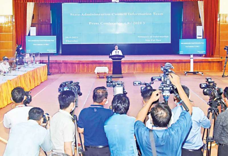 နိုင်ငံတော်စီမံအုပ်ချုပ်ရေးကောင်စီ၊ သတင်းထုတ်ပြန်ရေးအဖွဲ့၏ ၉/၂၀၂၁ ကြိမ်မြောက် သတင်းစာရှင်းလင်းပွဲကို ယနေ့ မွန်းလွဲပိုင်းတွင် ပြန်ကြားရေးဝန်ကြီး ဌာန၌ ကျင်းပရာ နိုင်ငံတော်စီမံအုပ်ချုပ်ရေးကောင်စီ၊ သတင်းထုတ်ပြန်ရေး အဖွဲ့ခေါင်းဆောင် ဗိုလ်ချုပ် ဇော်မင်းထွန်း၊ ပြည်ထောင်စုရွေးကောက်ပွဲကော်မရှင်အဖွဲ့ဝင် ဉီးခင်မောင်ဉီး၊ ဌာနဆိုင်ရာများမှ ပြောရေးဆိုခွင့် ရှိသူများနှင့် ဌာနဆိုင်ရာ သတင်းထုတ်ပြန်ရေးအဖွဲ့ ကိုယ်စားလှယ်များက သတင်းမီဒီယာများ၏ သိရှိလို သည့် မေးမြန်း မှုများကို ပြန်လည်ဖြေကြားသည်။