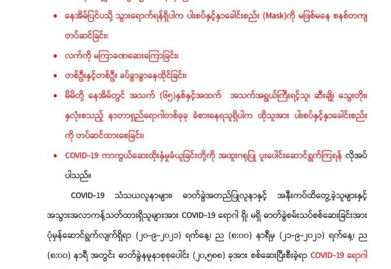 စီးပွားရေးနှင့် ကူးသန်းရောင်းဝယ်ရေးဝန်ကြီးဌာန အနေဖြင့် ကိုဗစ်-၁၉ ရောဂါကာကွယ်၊ ထိန်းချုပ်၊ ကုသရေးဆိုင်ရာပစ္စည်းများကို လေကြောင်း၊ ရေကြောင်းနှင့် နယ်စပ် ကုန်သွယ်ရေးစခန်းများမှ အဆင်ပြေချောမွေ့စွာ တင်သွင်းနိုင်ရေး အတွက် အချိန်နှင့်တစ်ပြေးညီ စီစဉ်ဆောင်ရွက်ပေးလျက် ရှိသည်။