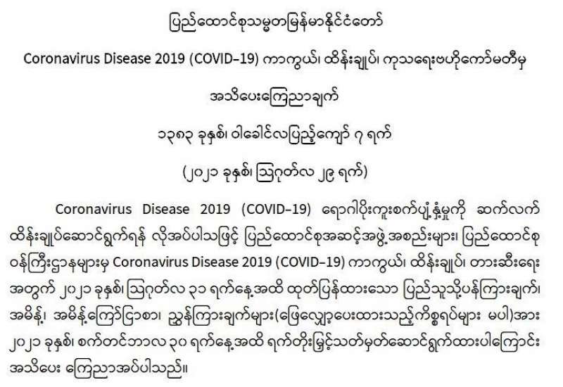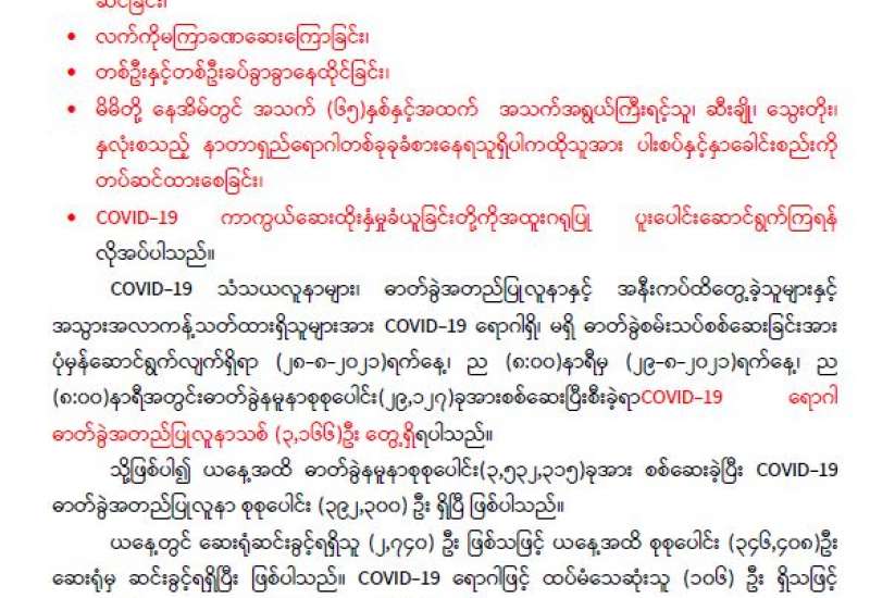 မြန်မာနိုင်ငံတွင် ကိုဗစ်-၁၉ ရောဂါ ဖြစ်ပွားမှုနှင့်ပတ်သက်၍ ယမန်နှစ် ပထမလှိုင်းနှင့် ဒုတိယလှိုင်းဖြစ်ပွားစဉ်က ရောဂါကူးစက်ဖြစ်ပွားမှု၊ ထိခိုက်မှုနည်းပါးခဲ့သော်လည်း ယခုနှစ် တတိယလှိုင်းဖြစ်ပွားချိန်တွင် ရောဂါကူးစက်မှု၊ ထိခိုက်ပျက်စီးမှု မြင့်မားခဲ့သည်ကို တွေ့ရမည် ဖြစ်သည်။ သို့သော် နိုင်ငံတော်စီမံအုပ်ချုပ်ရေးကောင်စီ၏ မျက်ခြည်မပြတ် အရေးတယူ ဆောင်ရွက်မှုနှင့် သက်ဆိုင်ရာတာဝန်ရှိသူများ စေတနာရှေ့ထား၍ ဖိဖိစီးစီးဆောင်ရွက်ပေးမှုများ ကြောင့် ယခုအခါ ကိုဗစ်-၁၉ ရောဂါကူးစက်ဖြစ်ပွားမှုနှုန်းမှာ အတိုင်းအတာတစ်ခုအထိ လျော့ကျလာသည်ဟု ဆိုနိုင်ပါသည်။