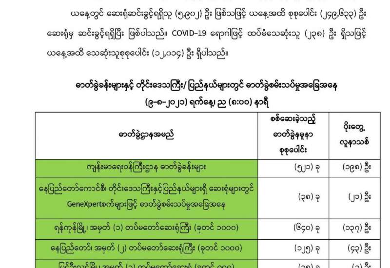 လက်ရှိကာလတွင် တိုင်းဒေသကြီးနှင့် ပြည်နယ်အများစု၌ ကိုဗစ်-၁၉ ရောဂါ ဖြစ်ပွားမှုသည် ယခင်ထက်စာလျှင် ၄၅ ရာခိုင်နှုန်းခန့်အထိ ကျဆင်းလာသည်ကို တွေ့ရပြီး အချို့သောတိုင်းဒေသကြီးနှင့် ပြည်နယ်များတွင်မူ ရောဂါဖြစ်ပွားနှုန်း တန်းနေခြင်းမျိုးကို တွေ့ရှိနေရသည်။ ကျန်းမာရေးဝန်ကြီးဌာနက ရောဂါကာကွယ်ထိန်းချုပ် နိုင်ရေးကို မနားမနေ ကြိုးပမ်းဆောင်ရွက်လျက်ရှိပြီး ပြည်သူများကလည်း ကိုယ့်နည်းကိုယ့်ဟန်တတ်နိုင်သမျှ ကြိုးစားဆောင်ရွက်နေကြသည်ကို တွေ့ရသည်။