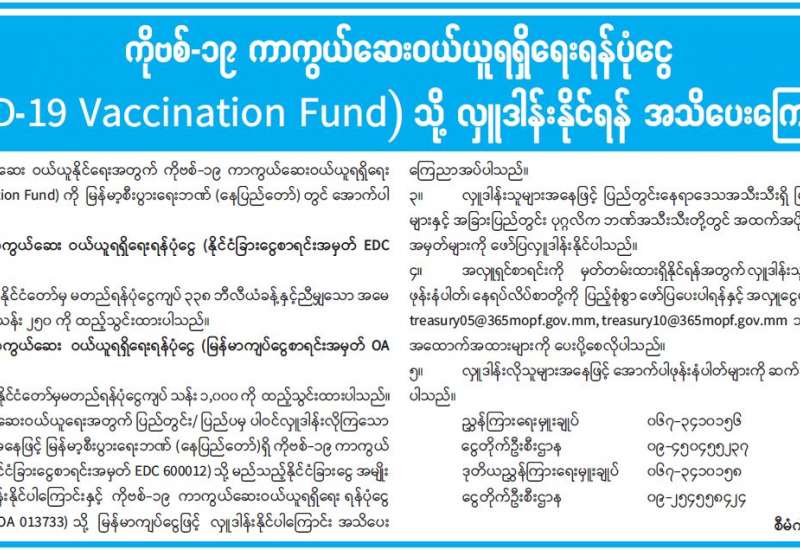 အကောက်ခွန်ဦးစီးဌာနအနေဖြင့် ကိုဗစ်-၁၉ရောဂါ ကာကွယ်၊ ထိန်းချုပ်၊ ကုသရေးဆေးနှင့် ပစ္စည်းများကို လေကြောင်း၊ ဆိပ်ကမ်း၊ နယ်စပ်ဂိတ်အသီးသီးမှ ရုံးပိတ်ရက်ရှည် ကာလအတွင်း နေ့စဉ်ရုံးပိတ်ရက်မရှိ လွယ်ကူ