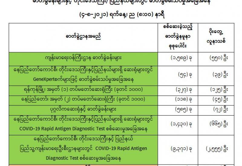 (၃-၈-၂၀၂၁) ရက်နေ့၊ ည (၈:၀၀) နာရီမှ (၄-၈-၂၀၂၁) ရက်နေ့၊ ည (၈:၀၀) နာရီအတွင်း ဓာတ်ခွဲနမူနာစုစုပေါင်း (၁၃,၄၇၄) ခုအား စစ်ဆေးပြီးစီးခဲ့ရာ COVID-19 ရောဂါ ဓာတ်ခွဲအတည်ပြု လူနာသစ် (၄,၀၅၁) ဦးတွေ့ရှိရပါသည်။ သို့ဖြစ်ပါ၍ ယနေ့အထိ ဓာတ်ခွဲနမူနာစုစုပေါင်း (၃,၂၀၉,၅၉၀) ခုအား စစ်ဆေးခဲ့ပြီး COVID-19 ဓာတ်ခွဲအတည်ပြုလူနာ စုစုပေါင်း (၃၁၅,၁၁၈) ဦး ရှိပြီ ဖြစ်ပါသည်။