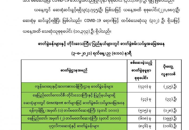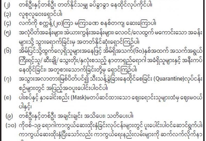“အာဆီယံအဖွဲ့ဝင်နိုင်ငံများအနက် မိမိတို့နိုင်ငံသည် ကူးစက်မှုနှုန်း ပဉ္စမအများဆုံး ဖြစ်ပြီး သေဆုံးမှုနှုန်းအနေဖြင့် တတိယအများဆုံးဖြစ်ကြောင်း၊ အဓိကအားဖြင့် မိမိတို့နိုင်ငံတွင် ကျန်းမာရေးနှင့်ပတ်သက်ပြီး အားနည်းချက်ရှိနေသည်ကို ဖော်ပြနေ ခြင်းဖြစ်ကြောင်း၊ ပြည်သူ များအနေဖြင့် ကျန်းမာရေးအသိများ အားနည်းခြင်းနှင့် ပင်ကိုအရ ကျန်းမာရေး အားနည်း ချက်များရှိခြင်းကြောင့်ဖြစ်ကြောင်း၊ မိမိတို့နိုင်ငံ၏မျှော်မှန်းသက်တမ်းသည်၆၇ ဒသမ ၇၈နှစ် သာရှိသဖြင့် အာဆီယံအဖွဲ့ဝင်နိုင်ငံများတွင် အနိမ့်ဆုံးဖြစ်ကြောင်း၊ ကိုဗစ်ရောဂါကူးစက်မှု ကြောင့်မဟုတ်ဘဲ မိမိတို့နိုင်ငံ၏ ကျန်းမာရေးမြှင့်တင်ရန် လိုအပ်နေခြင်းဖြစ်သည်ကို တွေ့ရှိ ရကြောင်း၊ တစ်နိုင်ငံလုံး ကျန်းမာရေးမြှင့်တင်ရေးသည် ရေရှည်မျှော်တွေး၍ မဖြစ်မနေ ဆောင် ရွက်ရမည့် လုပ်ငန်းဖြစ်ကြောင်း” ကိုဗစ်-၁၉ ရောဂါ ကာကွယ်၊ ထိန်းချုပ်၊ ကုသရေးဆိုင်ရာ ဆဋ္ဌမအကြိမ် ညှိနှိုင်းအစည်းအဝေးတွင် နိုင်ငံတော်စီမံအုပ်ချုပ်ရေးကောင်စီ ဥက္ကဋ္ဌ ဗိုလ်ချုပ် မှူးကြီး မင်းအောင်လှိုင်က ပြောကြားခဲ့သည်။