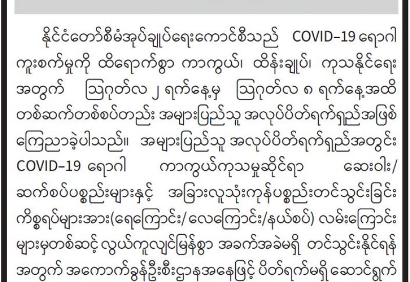 နိုင်ငံတော်အစိုးရအနေဖြင့် ကိုဗစ်-၁၉ ရောဂါ (တတိယလှိုင်း) ကူးစက်ပြန့်ပွားမှု မဖြစ်ပွားမီကာလကပင် လိုအပ်သည့် ကြိုတင်ပြင်ဆင်စုဖွဲ့မှုများကို လုပ်ဆောင်ခဲ့ပြီး ကူးစက်ပြန့်ပွားမှုဖြစ်ပေါ်လာသည့်ကာလအတွင်းတွင်လည်း အတည်ပြုလူနာ၊ စောင့်ကြည့်လူနာ များအား ကျန်ရှိသည့် တာဝန်သိကျန်းမာရေးဝန်ထမ်းများ၊ လူမှုကူညီကယ် ဆယ်ရေးအသင်း အဖွဲ့များနှင့် တပ်မတော်သားကျန်းမာရေးအဖွဲ့များ ပူးပေါင်း၍ ကုသရေးလုပ်ငန်းများကို အင်တိုက်အားတိုက် ဆောင်ရွက်ခဲ့သည်။ ၎င်းအပြင် ရောဂါကူးစက်မှုအရ အရေးပေါ်လိုအပ် လာသည့် အောက်ဆီဂျင်များကို လုံလောက်စွာ ပေးဝေနိုင်ရေးအတွက် ပြည်တွင်းရှိ နိုင်ငံပိုင်နှင့် ပုဂ္ဂလိကပိုင် စက်ရုံ၊ အလုပ်ရုံများမှ တိုးမြှင့်ထုတ်လုပ်ခြင်း၊ ပြည်ပမှလျင်မြန်စွာတင်သွင်းခွင့်ပြုခြင်း စသည်တို့ဖြင့် ပြည်သူလူထု၏ အသက်အိုးအိမ်ကို ထိခိုက်ဆုံးရှုံးမှုမရှိစေရေး အလေးထားဆောင်ရွက် ခဲ့သည်။